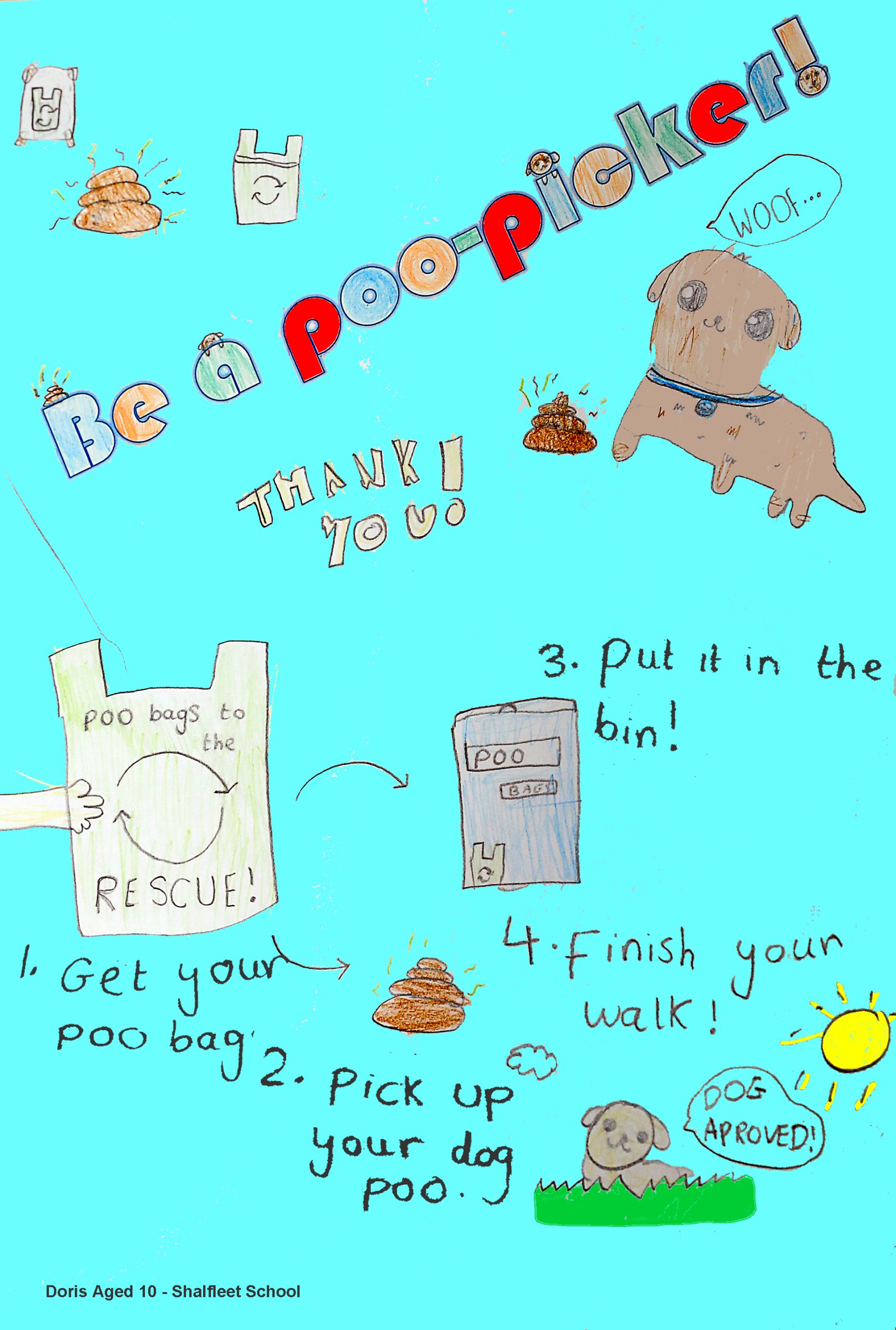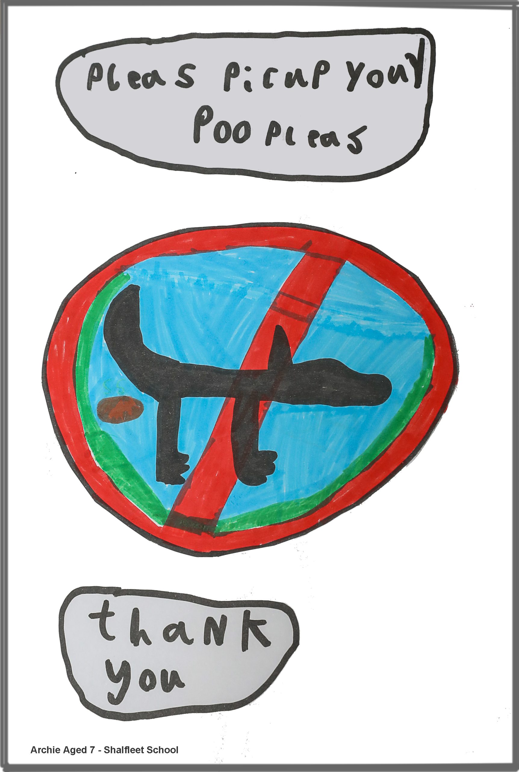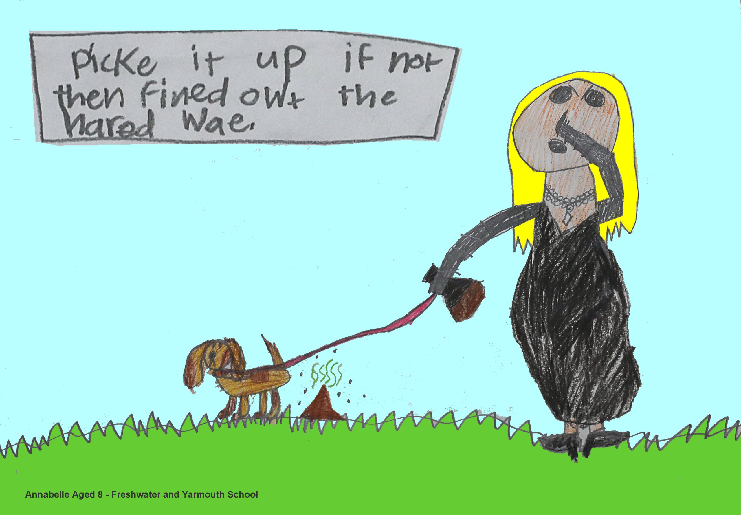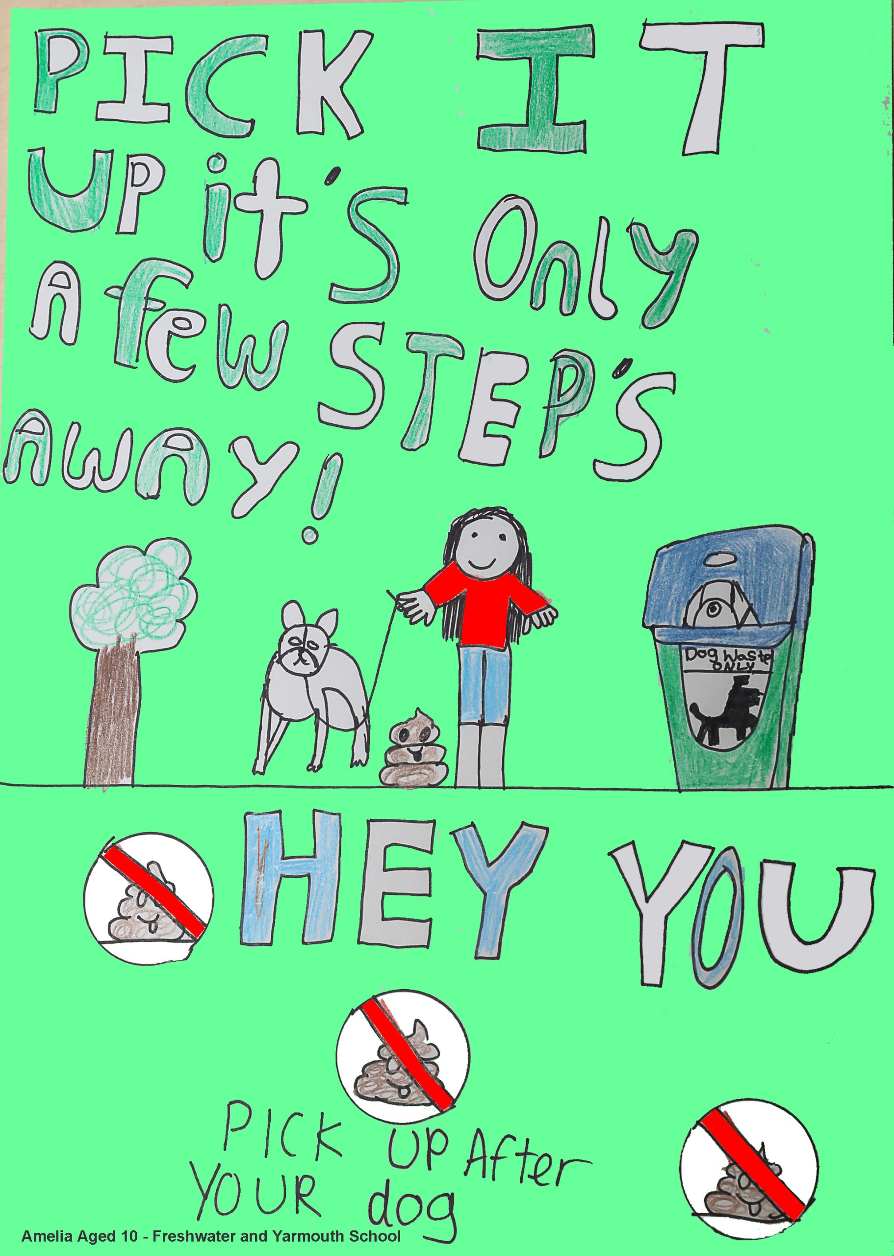 Not a very pleasant subject but certainly an issue for Yarmouth. To help tackle the problem, the council asked local school children in Yarmouth, Freshwater and Shalfleet to enter a competition to design posters for a campaign. From one hundred entries five were chosen which are now displayed around Yarmouth and Freshwater. The purpose is to raise awareness of the problem and to encourage dog owners to always carry poo-bags, pick it up and either bin it or take it home. Bags can be placed in the red dog bins (preferably) or in black bins, or in the general waste at home.